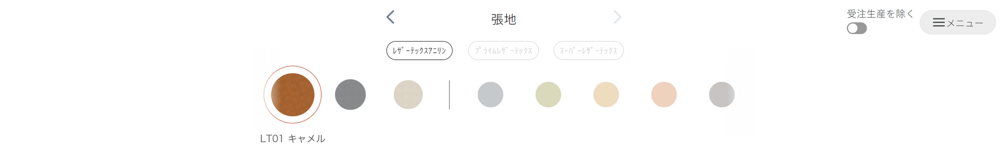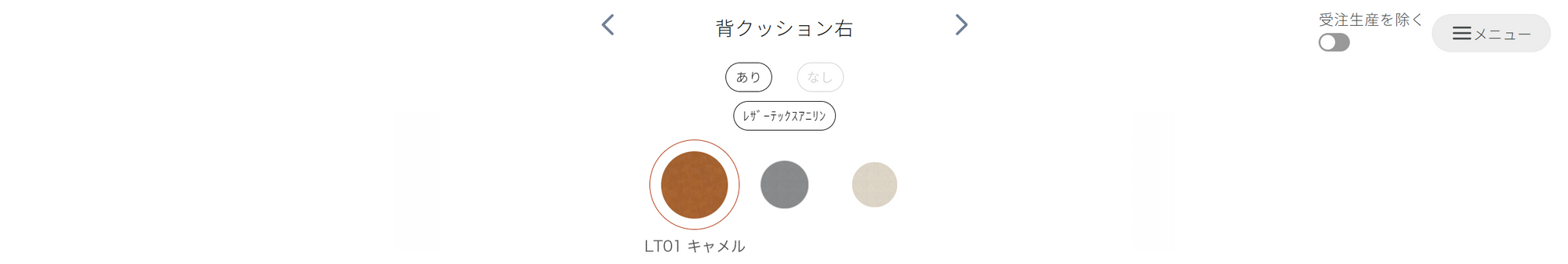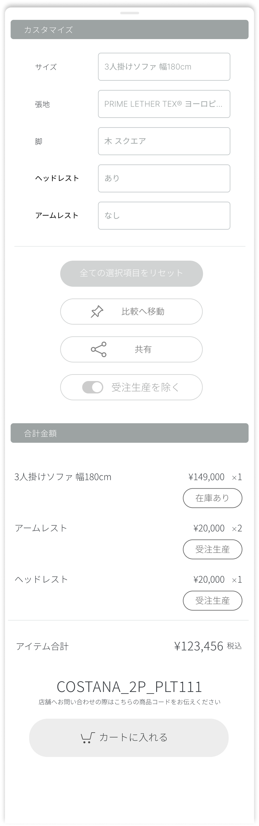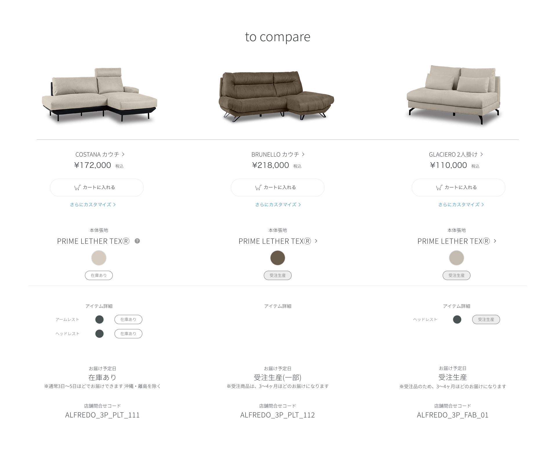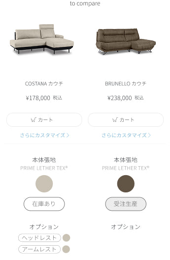 様々な張り地やオプションの有無、サイズや価格などカスタマイズした商品を最大3つまで同時に比較検討可能です。