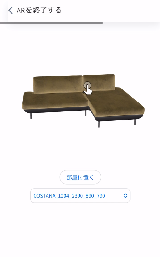 - AR機能による家具の配置は、あくまでイメージをご確認いただくためのシミュレーションです。シミュレーション結果は、実際の家具のサイズ・仕様・色味・素材感等を正確に再現・保証するものではありません。ご購入前には、製品ページの詳細情報をご確認ください。