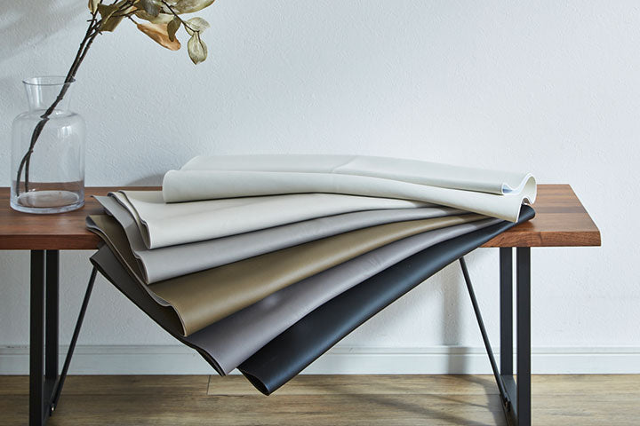 マットで落ち着いた発色とカラーバリエーションが特徴。ヌバックレザーのような短い毛羽立ちと、柔らかくしっとりとした肌触りが魅力です。通気性が良く、夏は快適、冬は優しい温もりを感じさせます。インテリアに自然に馴染む美しい発色と、少し起毛感のあるなめらかな肌ざわりが空間に上質な印象を与えます。