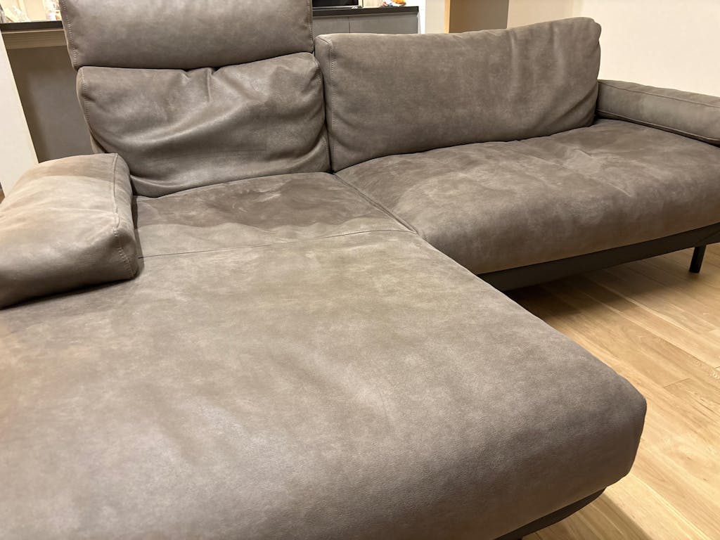開梱時に稀に表面のシワ、変形等が見られる場合がありますが、輸送中におこったものなので、ご使用されるうちに自然に回復します。また、叩いたり張地を軽く引っ張ると回復も早くなります。